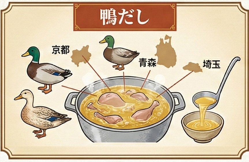 京都、青森、埼玉など全国各地から厳選した合鴨を、鴨だしに使用しております。