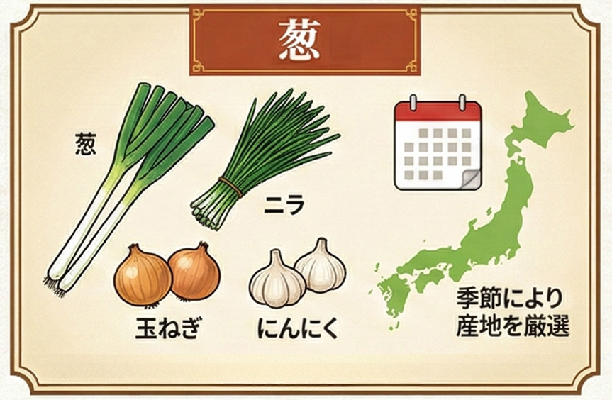 葱、ニラ、玉ねぎ、にんにく等、鴨と相性抜群のユリ科ネギ属の中から、季節により産地を厳選して日本各地から取り揃えております。