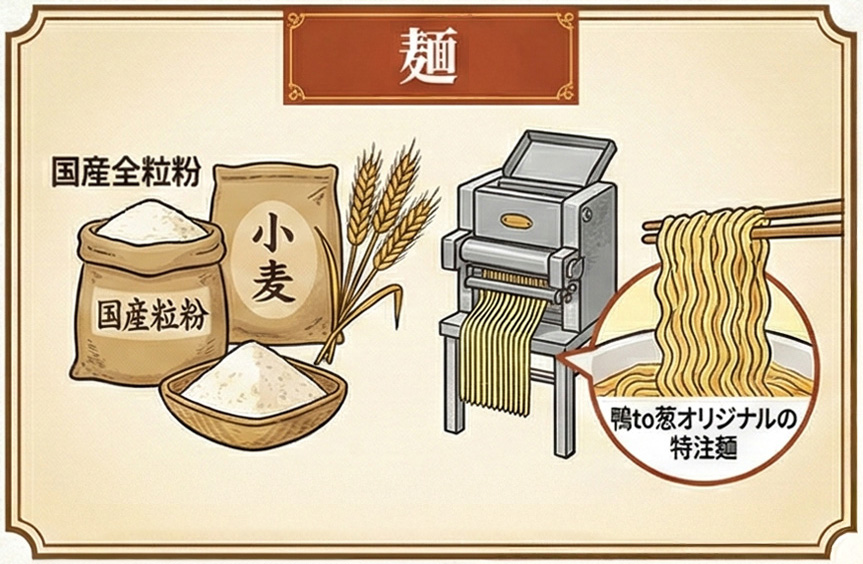 国産全粒粉と小麦をブレンドした、鴨to葱オリジナルの特注麺を使用しています。