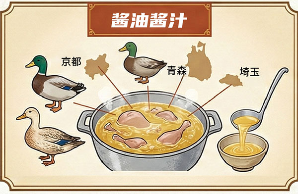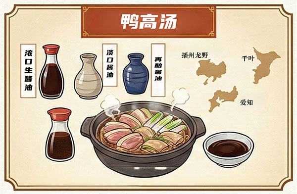 选用来自播州龙野、千叶、爱知等地严选的浓口生酱油、淡口酱油及再仕酱油,结合鸭肉与葱精心调制而成秘制酱汁。