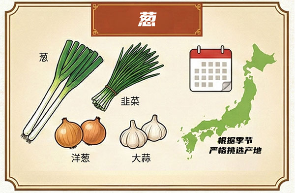 从与鸭肉极为相配的百合科葱属食材中,如葱、韭菜、洋葱、大蒜等,根据季节严选产地,自日本各地精心采购。