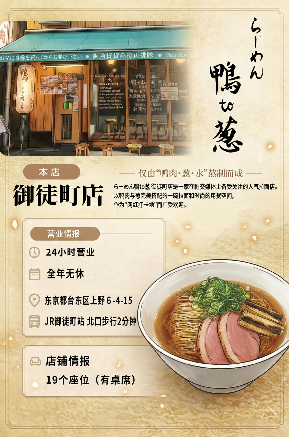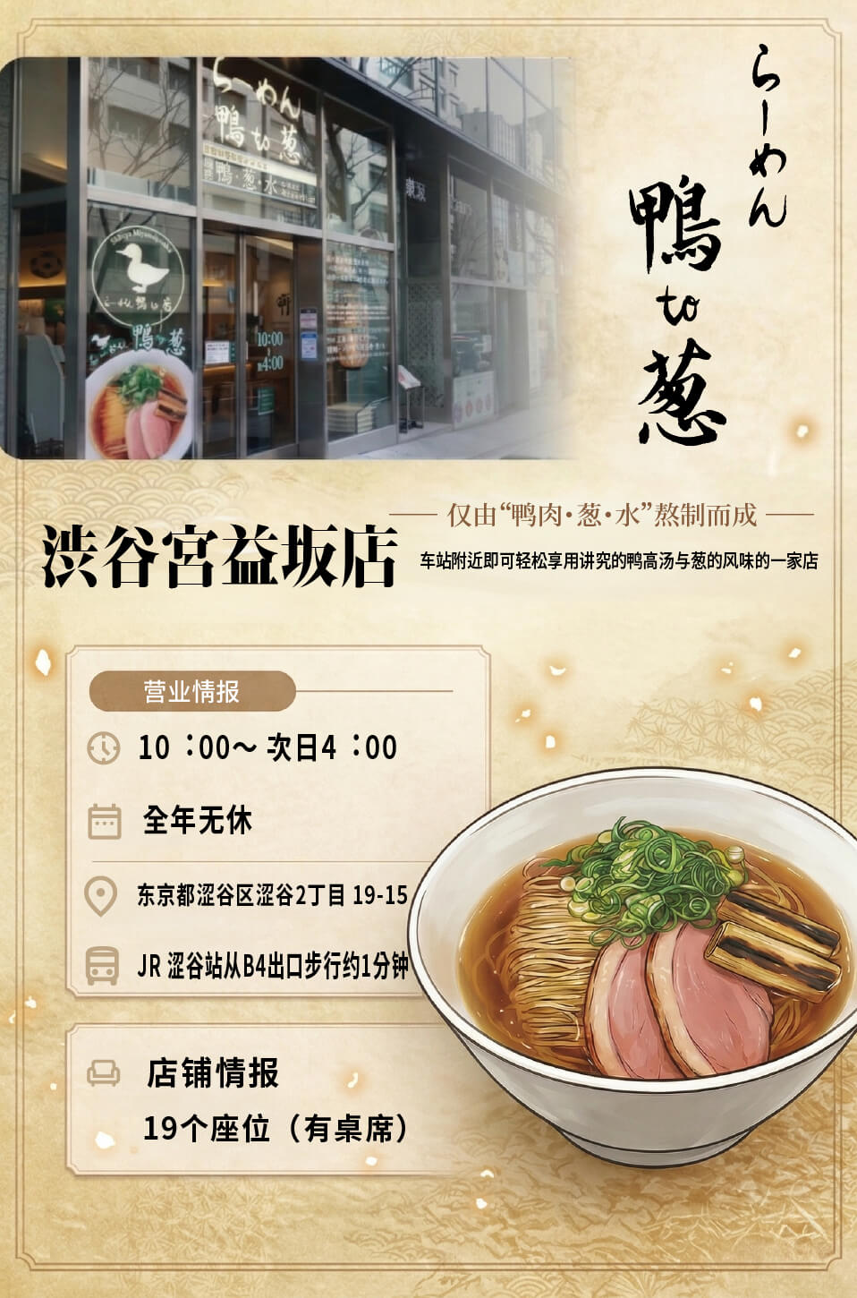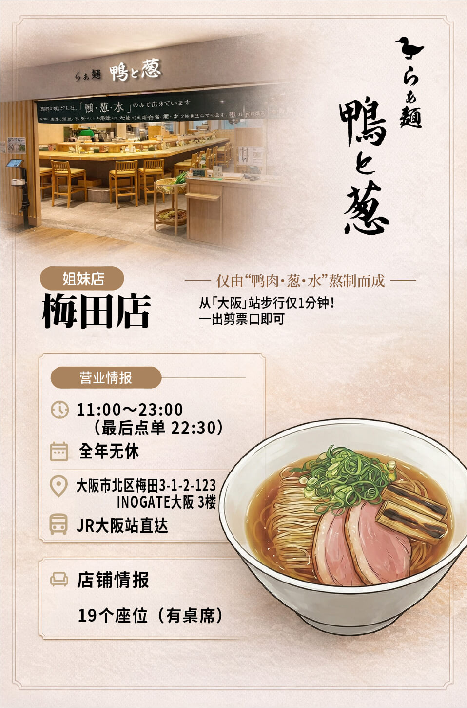 以“鸭肉・葱・水”熬制而成的汤底拉面。